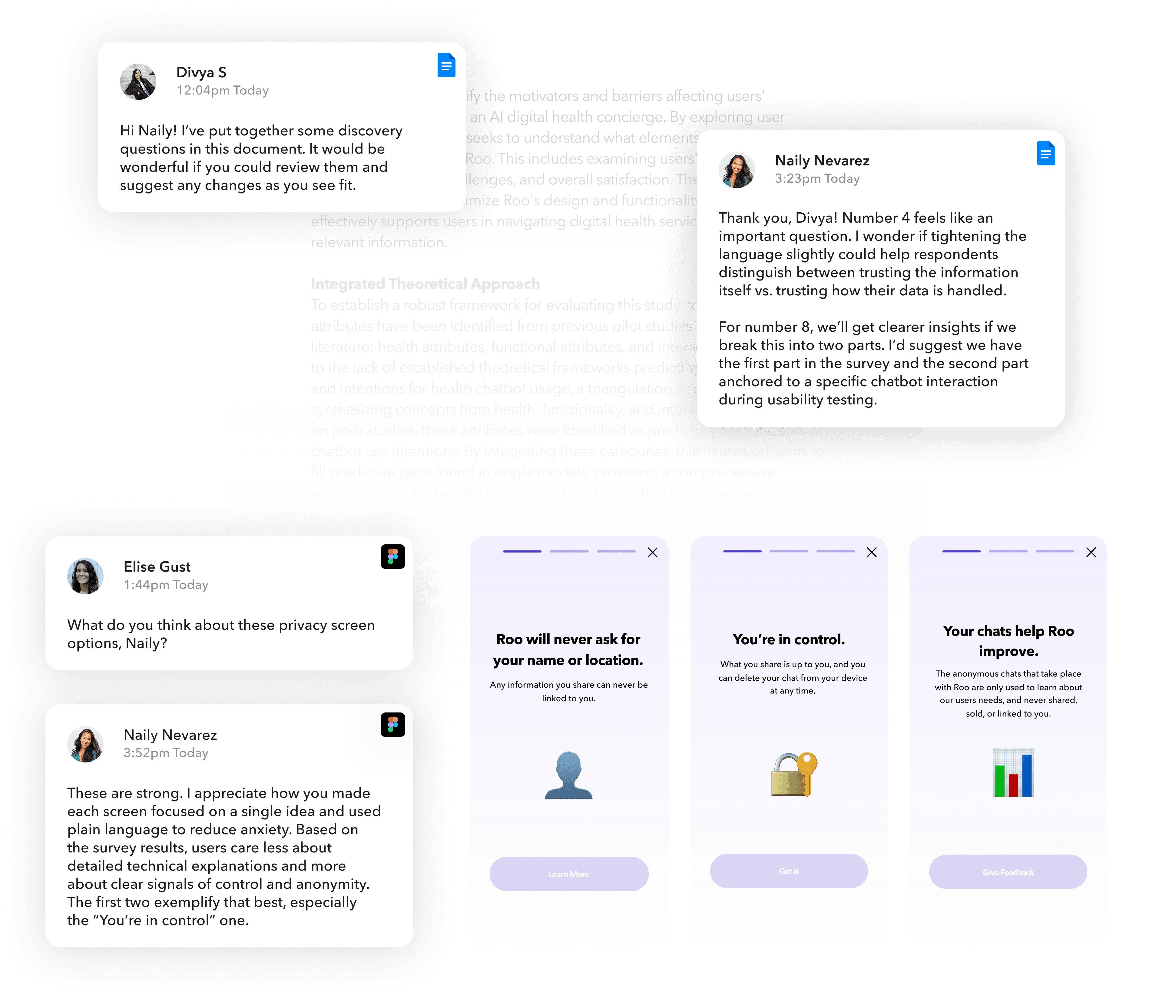 At a moment when AI adoption in healthcare was accelerating, Planned Parenthood lacked the research needed to guide responsible investment. An existing AI education chatbot, Roo, supported millions of users seeking sexual and reproductive health information, yet key questions about user expectations for AI remained unanswered. I initiated and led a research partnership with Divya S from the University of Georgia. The studies provided our team with a clear foundation for building on an existing AI product.